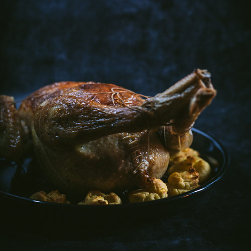 - Enfourner pour 10 minutes puis baisser la température à 180°C pendant le reste du temps de cuisson, 1h30 environ. Celui-ci peut varier en fonction de la taille de votre chapon. Vérifier la cuisson régulièrement et arroser avec le jus de cuisson.